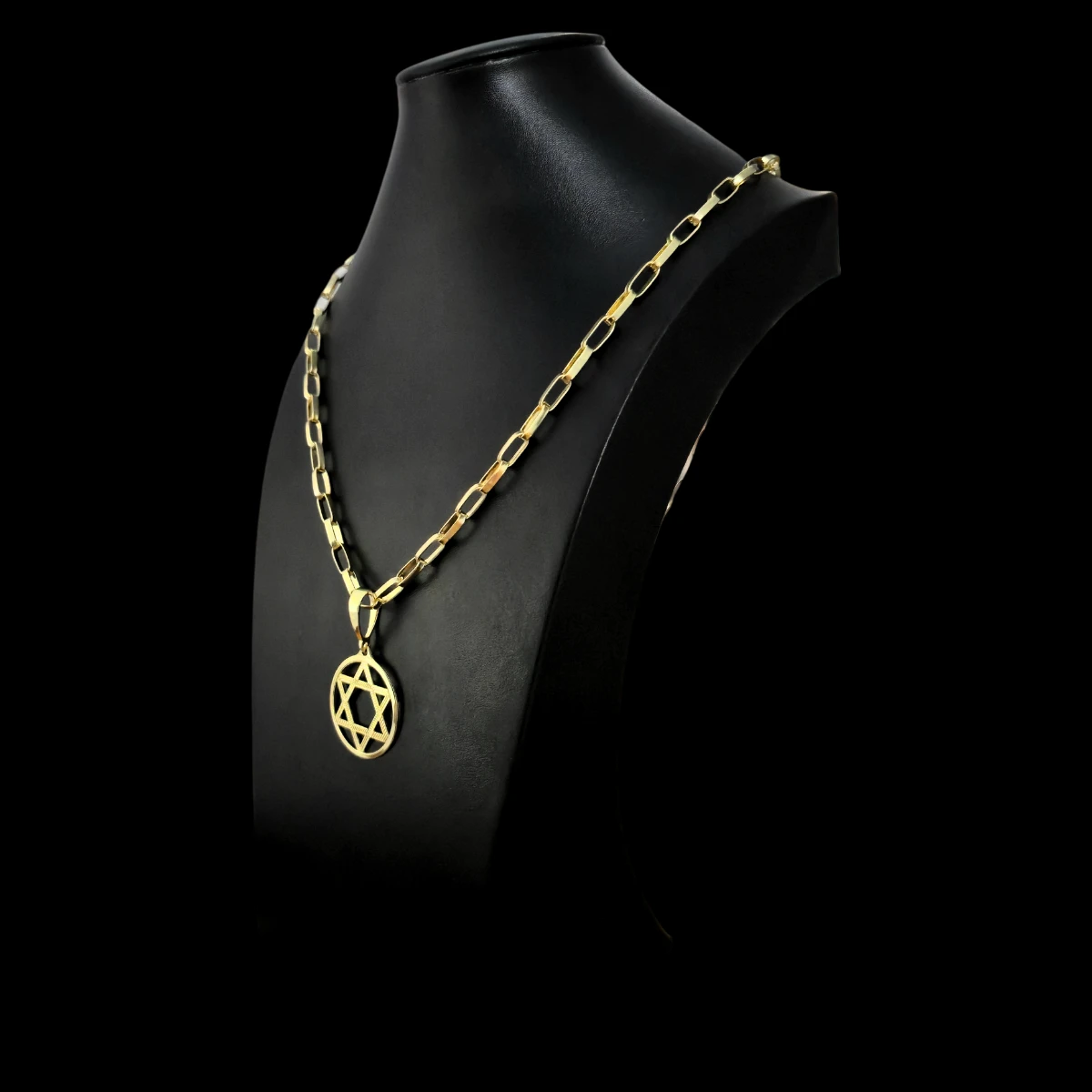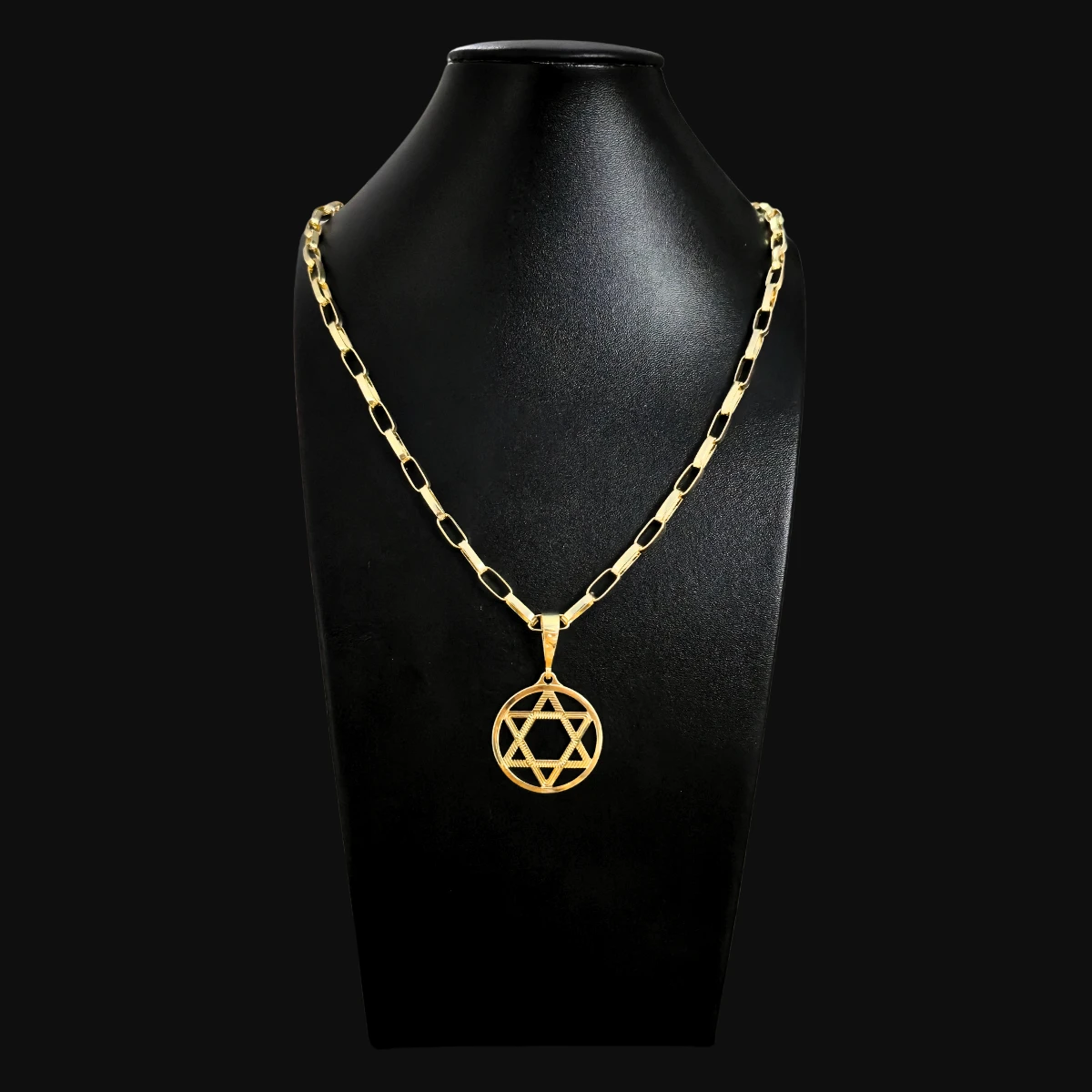 Corrente de elos longos e robustos com pingente vazado da Estrela de Davi. Conjunto banhado a ouro que combina tendência (elos modernos) e simbolismo, perfeito para adicionar presença e significado ao seu visual.